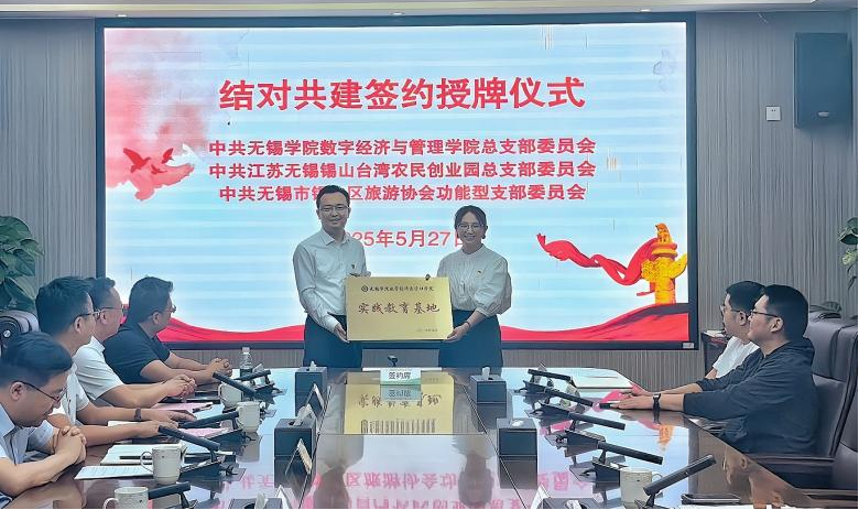 在与会嘉宾的共同见证下,数字经济与管理学院向锡山台创园颁授“实践教育基地”牌匾。同时,数字经济与管理学院党总支与锡山台创园党总支和区旅游协会功能型党支部签署三方共建协议书,明确在党建交流、产业融合、人才培养等领域的合作方向。