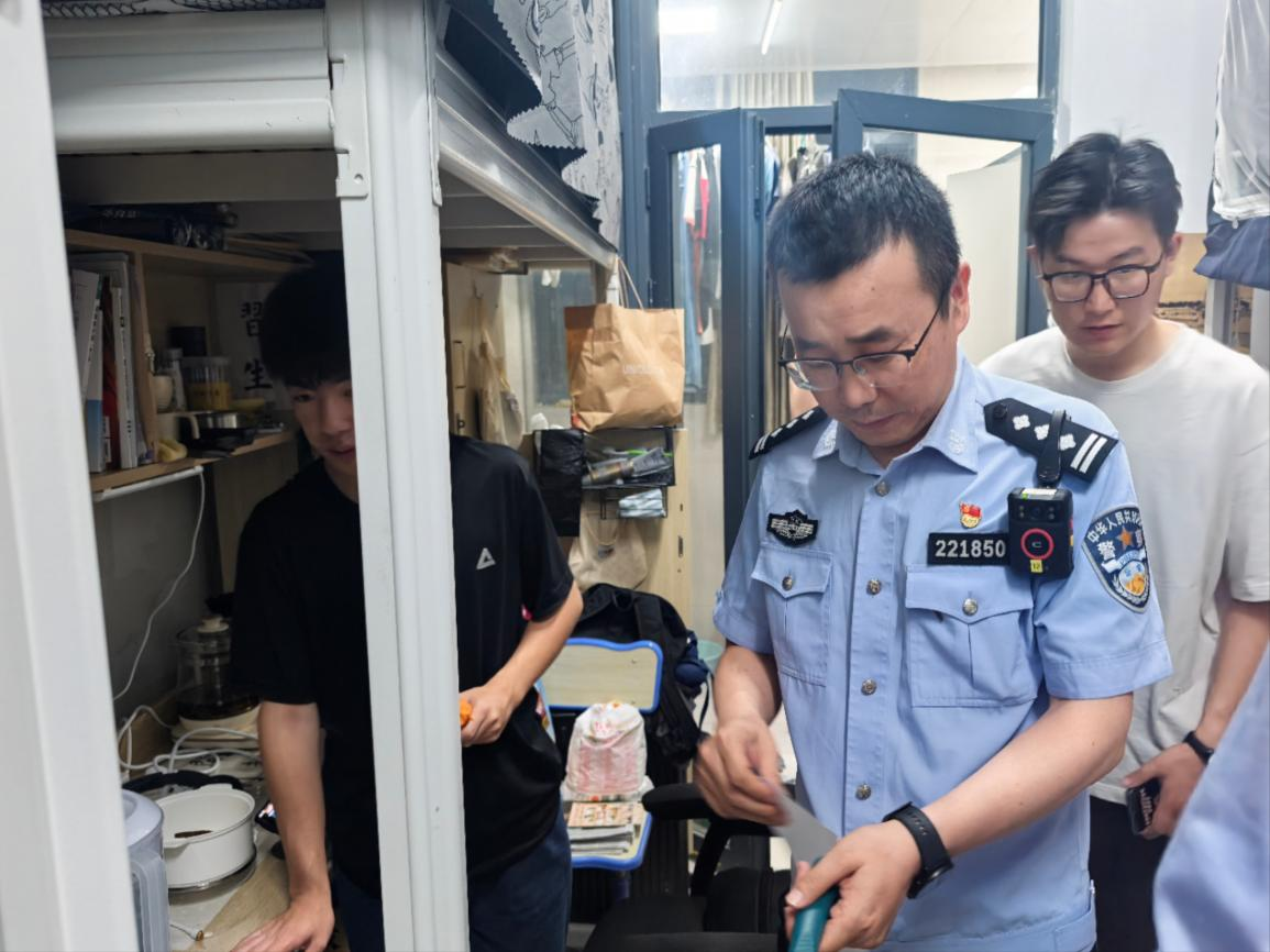 此次检查围绕近期校园宿舍安全防范重点,检查宿舍消防设施设备和卫生环境,排查宿舍矛盾纠纷、管制刀具和大功率违章电器等。保卫处人员现场检查了消防栓维保记录、查看应急照明设备等消防器材。驻校民警和学生工作处人员在宿舍与学生进行交流,强调宿舍消防安全、用电安全的重要性,结合节日期间诈骗高发特点,通过典型案例向学生宣讲防范诈骗。