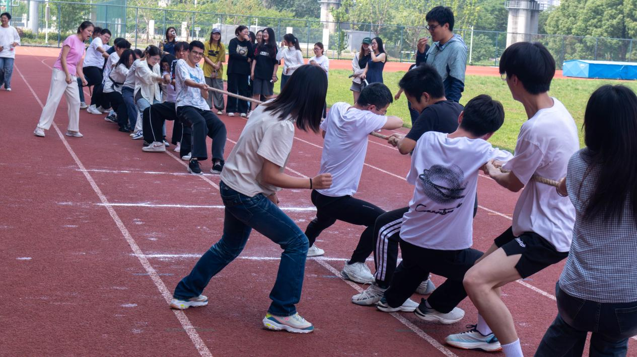 凝“绳”聚力,拔出精彩。在“力‘拔’青春”拔河比赛环节,师生联合组队,每支队伍都包含一位班主任和14名班级学生代表。随着裁判员一声令下,师生配合同台竞技,鼓足干劲倾尽全力,以热情、积极的精神点燃了现场气氛。拔河比赛不仅展现了学子蓬勃向上的朝气和奋勇争先的精神面貌,更培养了坚韧不拔的意志。经过多轮激烈角逐,24金融2班勇夺冠军,24统计2班斩获亚军,24国贸2班荣获季军。