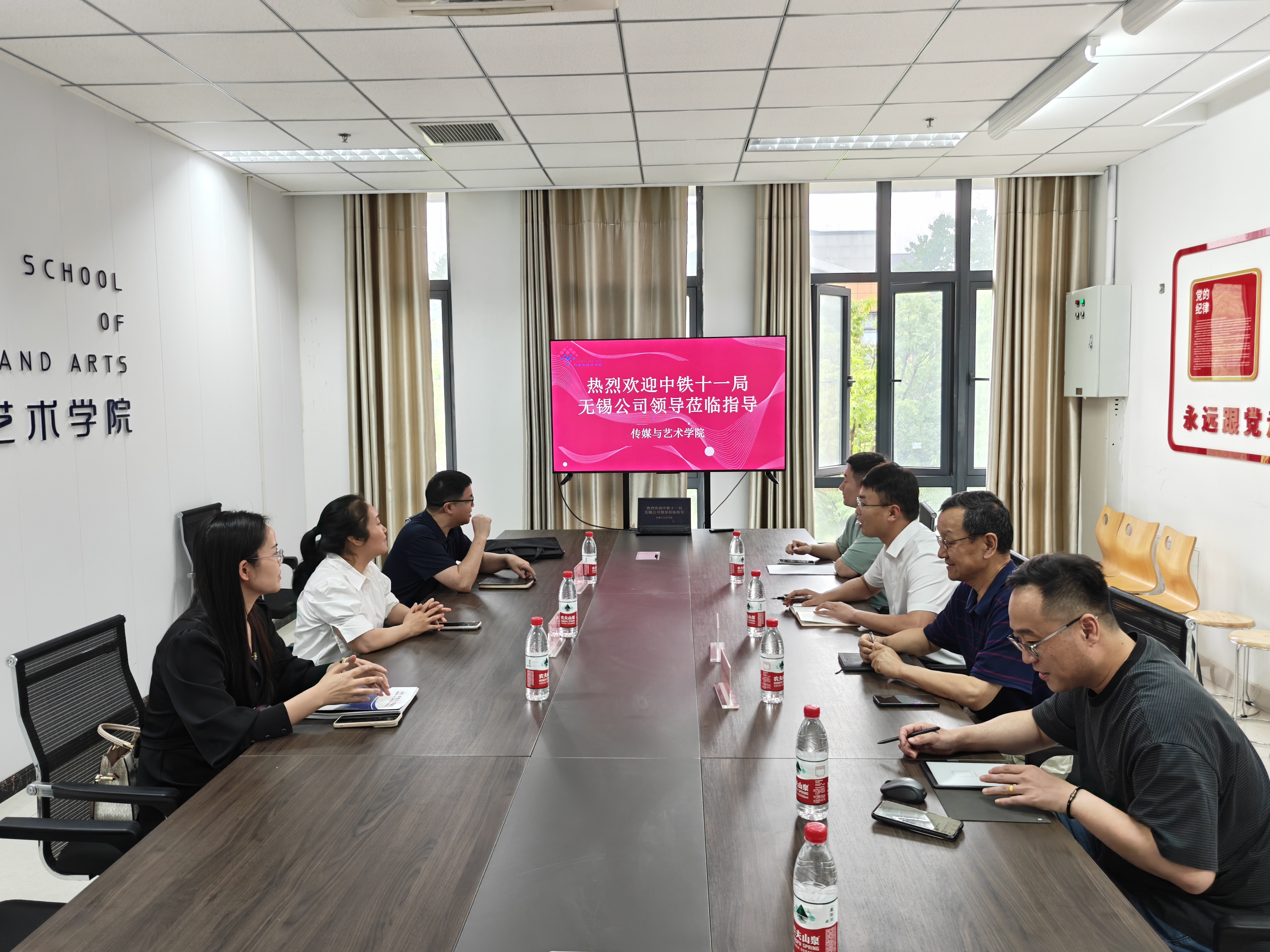 6月10日下午,中铁十一局集团第七工程有限公司党群工作部部长夏琴,传媒公司总经理苏秀琴,锡山区工会组织部部长丁松林一行来我校传媒与艺术学院开展校企合作调研交流。校工会副主席安杰,传媒与艺术学院副院长刘棠,党总支副书记郭新宇及教师代表参与座谈会。