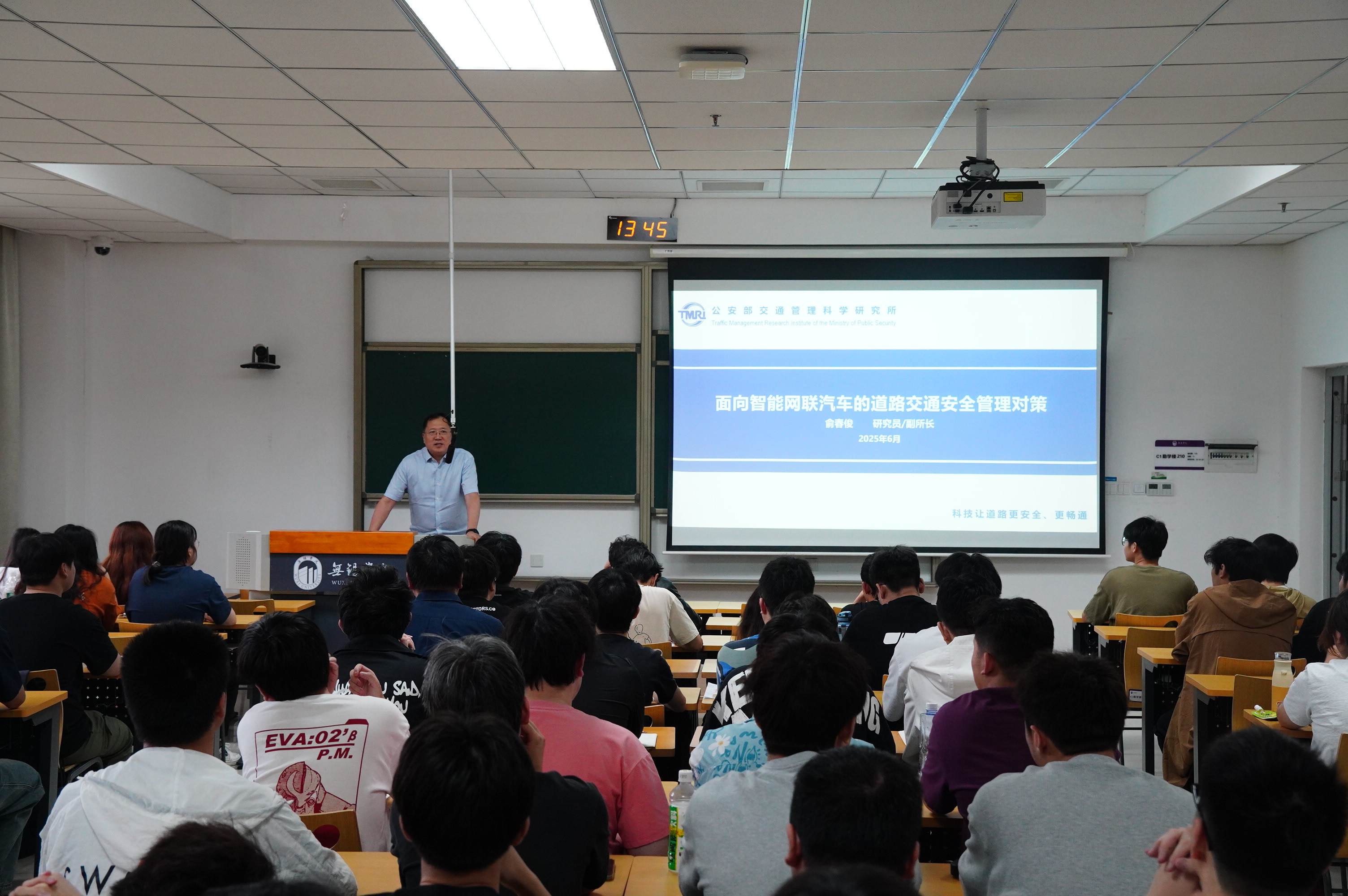 公安部交通管理科学研究所副所长、研究员俞春俊围绕智能网联汽车的发展主题,为22车辆和22轨道专业的学生系统讲解了自动驾驶的发展历程、技术路线、趋势及挑战。他结合时事新闻热点,针对自动驾驶技术存在的交通安全隐患提出了前瞻性解决方案。本次讲解不仅激发了同学们对交通前沿科技的浓厚兴趣,更引导大家勇担科技强国使命,培养追求真理、敢于创新、精益求精的科学态度。