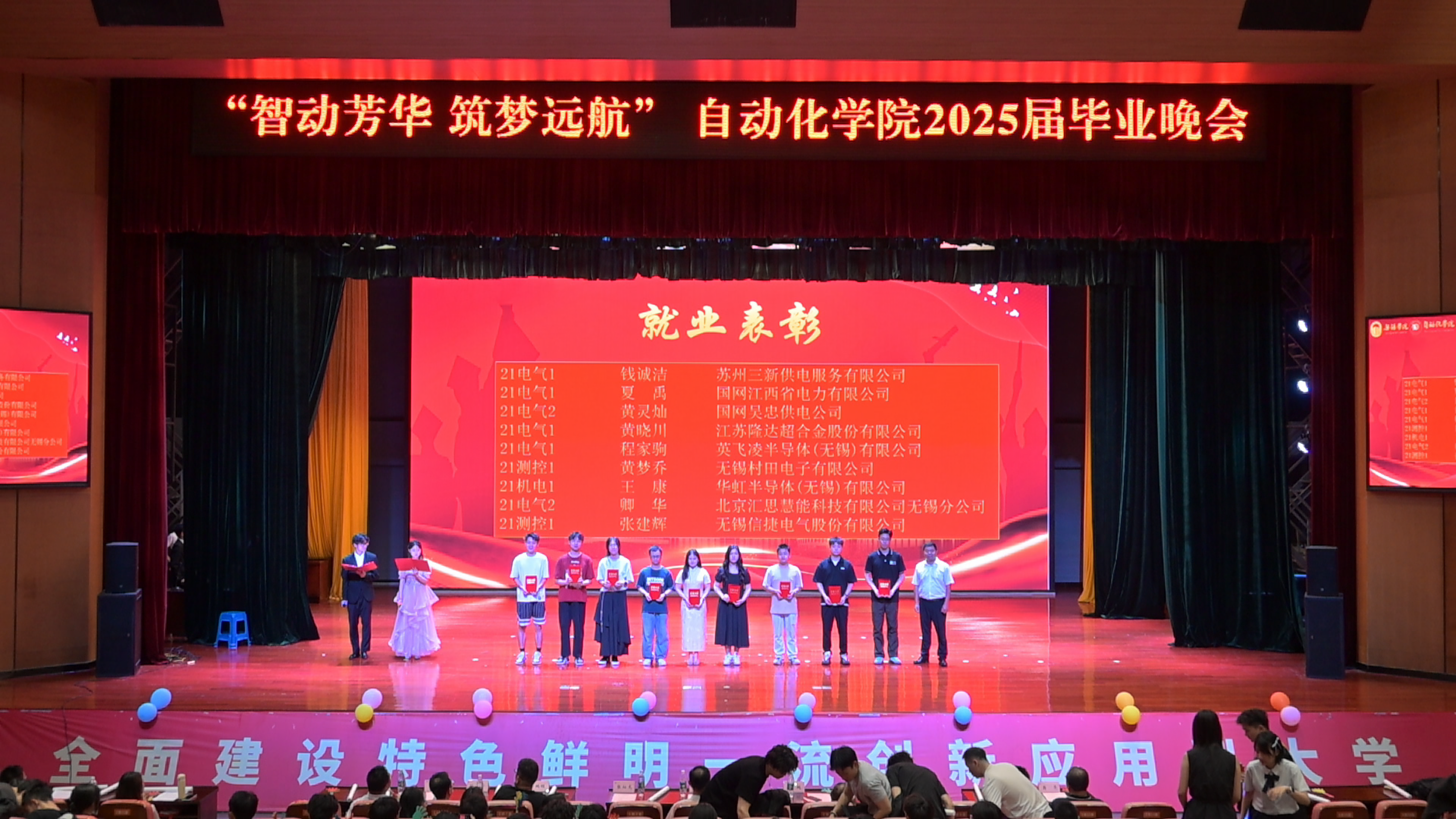 6月18日晚,自动化学院在大礼堂2楼举办2025届毕业生晚会暨表彰大会。校党委常委、副校长左同宇,党委学生工作部部长、学生工作处处长张灿龙,团委副书记费鹏程,党委学生工作部副部长张明亮,创新创业学院院长孙宁,信息化建设与管理中心副主任夏庆锋,自动化学院院长李鹏、党总支副书记王明杰、副院长蒋亮出席活动。自动化学院2025届300余名毕业生欢聚一堂,共同度过了一个难忘的夜晚。