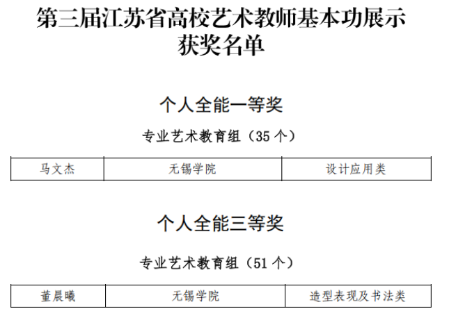 近日,江苏省教育厅公布了第三届江苏省高校艺术教师基本功展示获奖名单。在学校教师发展与教学评估中心的组织和指导下,我校传媒与艺术学院马文杰老师荣获专业艺术教育组个人全能一等奖,董晨曦老师斩获专业艺术教育组个人全能三等奖,这一成果实现了我校在该项省级展示活动中的历史性突破。