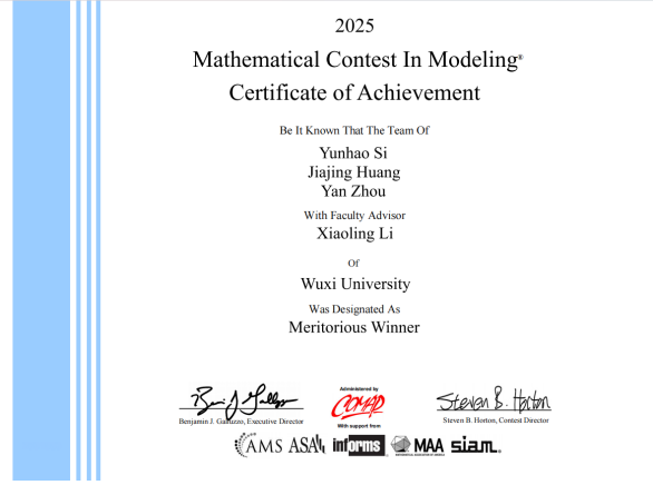 近日,2025年美国大学生数学建模竞赛(MCM/ICM)获奖结果揭晓。由我校大气与遥感学院司芸浩、物联网工程学院周砚和黄嘉婧三位同学组成的团队在本次竞赛中荣获一等奖(Meritorious Winner),这是我校近年来在各类数学建模竞赛中取得的最好成绩。
