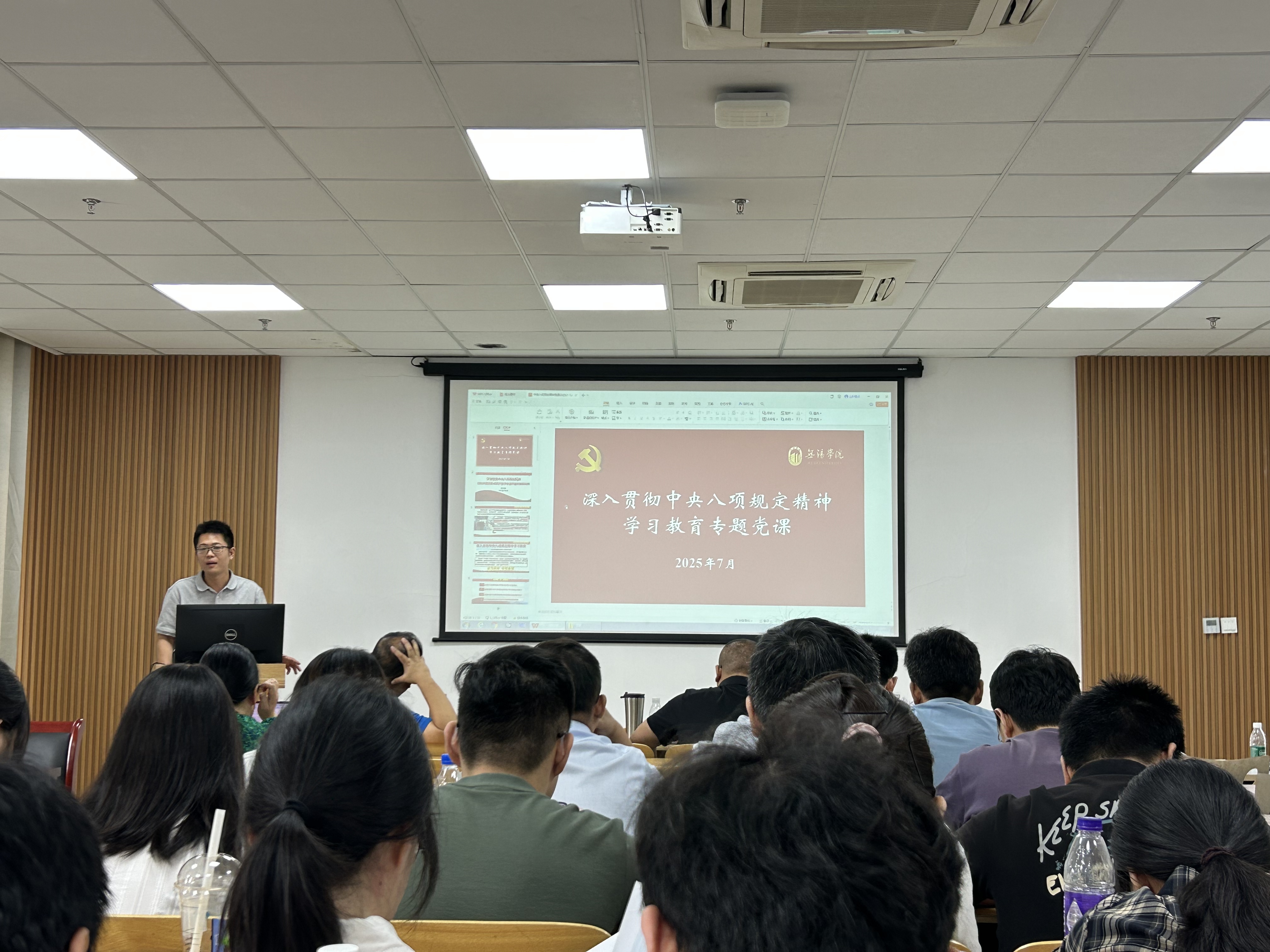 自动化学院党总支副书记王明杰主讲深入贯彻中央八项规定精神学习教育专题党课。他重点阐述了中央八项规定出台的背景、核心内容和重大意义,并深度剖析了近年来教育系统内发生的违反中央八项规定精神的典型案例。他号召全院教职工深刻认识作风建设的长期性、复杂性,始终保持清醒认识,时刻绷紧纪律之弦,警惕“舌尖上的浪费”等顽疾,把中央八项规定精神内化于心、外化于行,为学院事业发展提供坚强作风保障。
