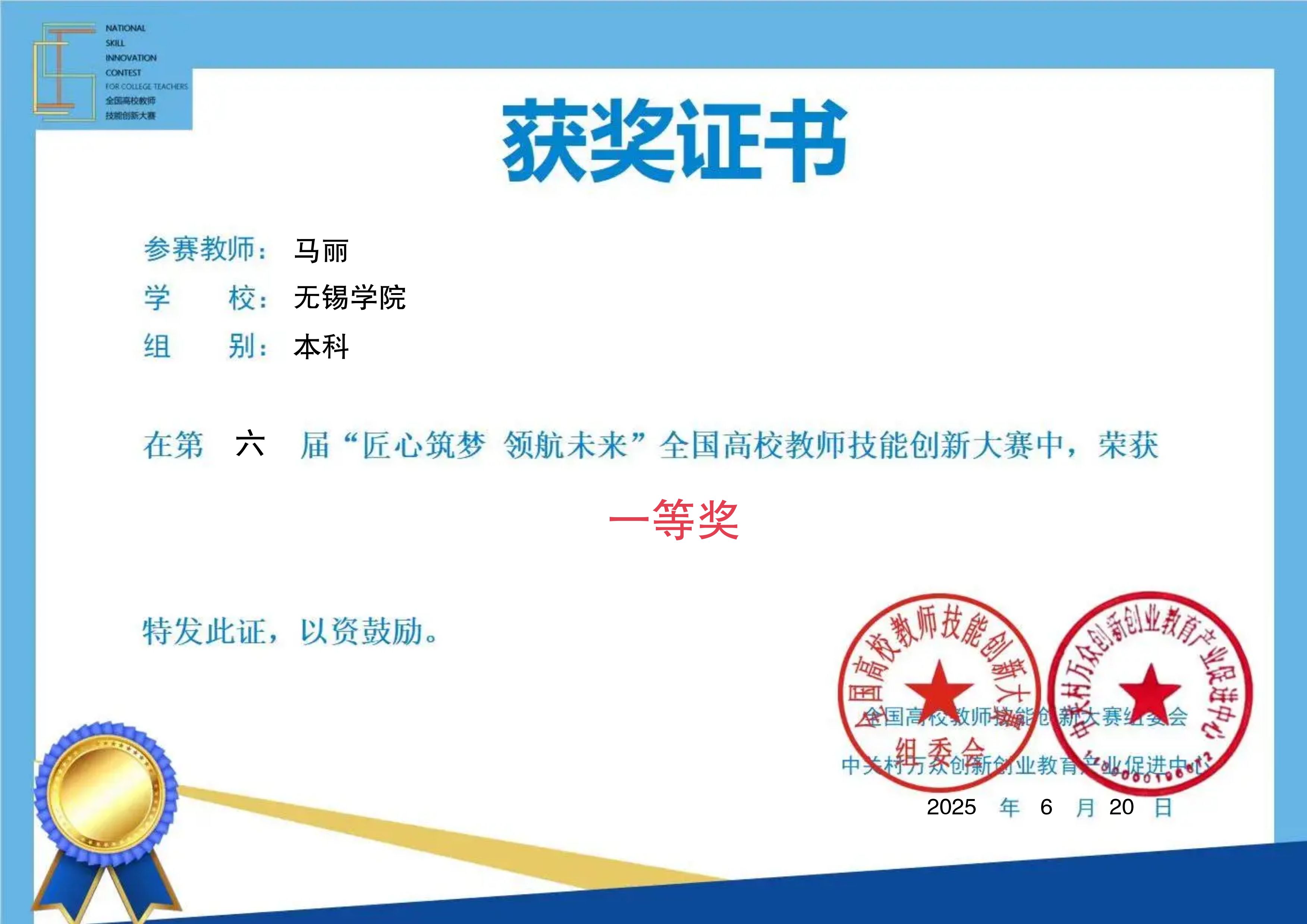 日前,第六届“匠心筑梦 领航未来”全国高校教师技能创新大赛决赛落下帷幕,物联网工程学院教师马丽经过多轮环节的激烈角逐,在309所高校1057组复赛队伍中脱颖而出,荣获全国一等奖,实现我院教师教学竞赛的再次突破。