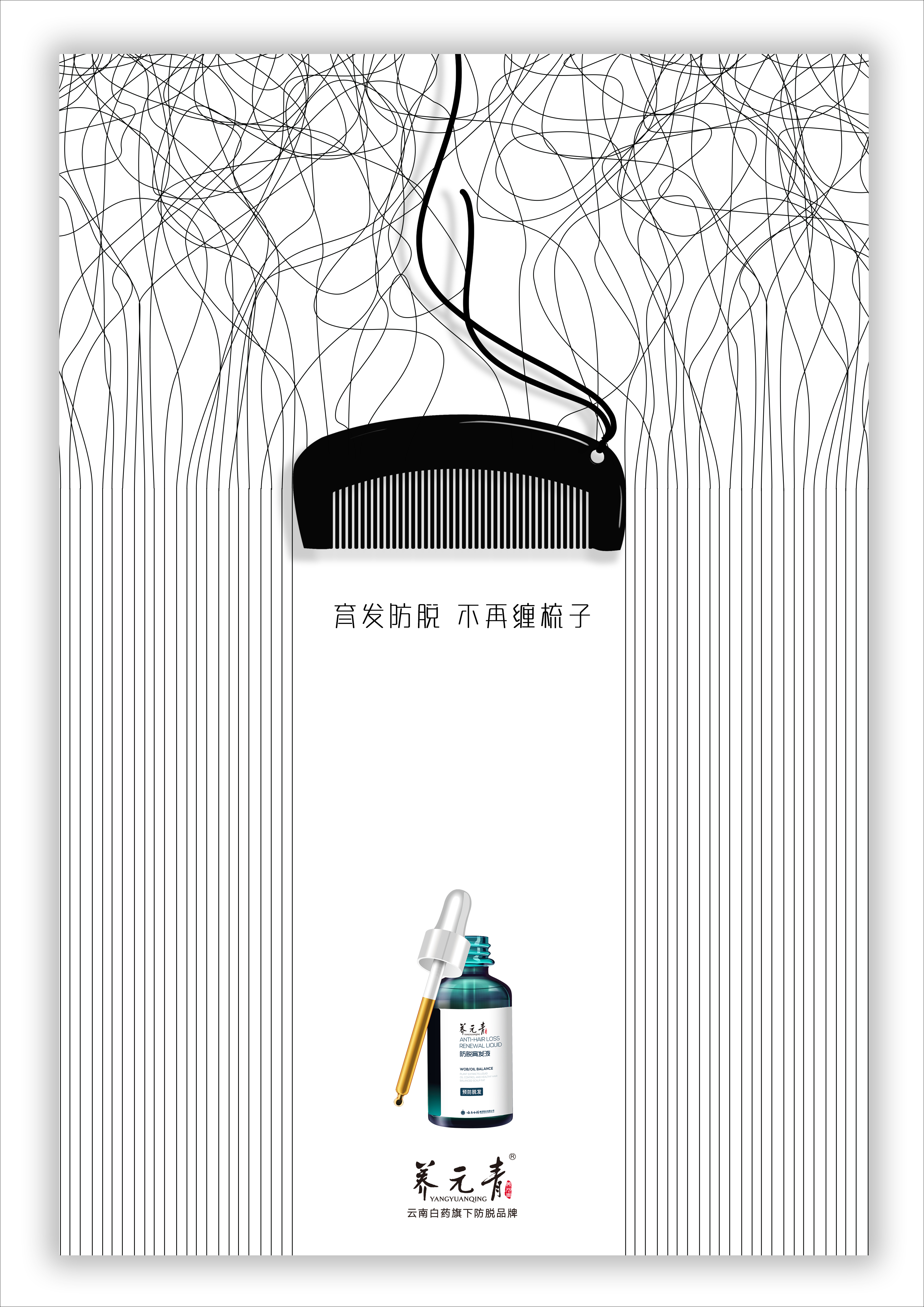 创意说明:养元青洗发水海报以防脱为核心,借“扫把缠发”“梳子挂发”“地漏堵发”场景,连接消费者脱发痛点,凸显产品实用价值。视觉上用左右对比构图,展现发丝从毛躁到垂顺,强化防脱与柔顺双重功效,塑造“头皮健康管理专家”形象,提升购买欲。
