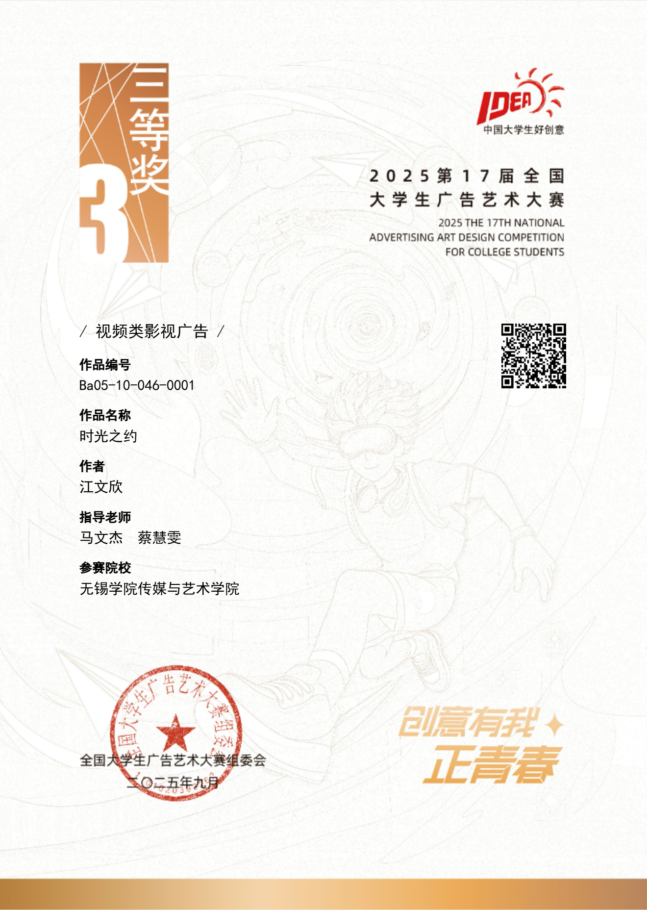 4.国赛三等奖视频类影视广告《时光之约》作者:江文欣,指导老师:马文杰、蔡慧雯