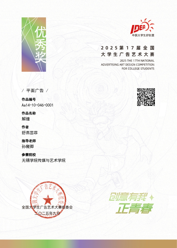 全国大学生广告艺术大赛是教育部高等教育司支持,教育部高等学校新闻传播学类专业教学指导委员会、中国高等教育学会广告教育专业委员会共同主办的全国性高校设计类竞赛。自2005年创办以来,大广赛已成功举办十七届,成为中国规模最大、覆盖院校最广、参与人数最多、作品水准最高的文科类竞赛之一,是面向全国大学生的重要广告创意实践活动。传媒与艺术学院积极构建“以赛促练、以赛促学、以赛促教、以赛促改、以赛促研、以赛促就、以赛立德”的实践教学平台,致力于培养具有国际视野、独立精神和时代活力的“新艺术”人才。学院在尊重学生个性的基础上激发其创造能力,落实“立德树人”根本任务,坚持以人民为中心的艺术导向,践行艺术的时代使命,引导学生关注社会、关注民生,以艺术作品反映时代精神与社会现实。本次大赛的优异表现,充分体现了学院学生对艺术学科创新实践的深入理解,展现了学院扎实的专业教学基础和青年学子的卓越创意能力。