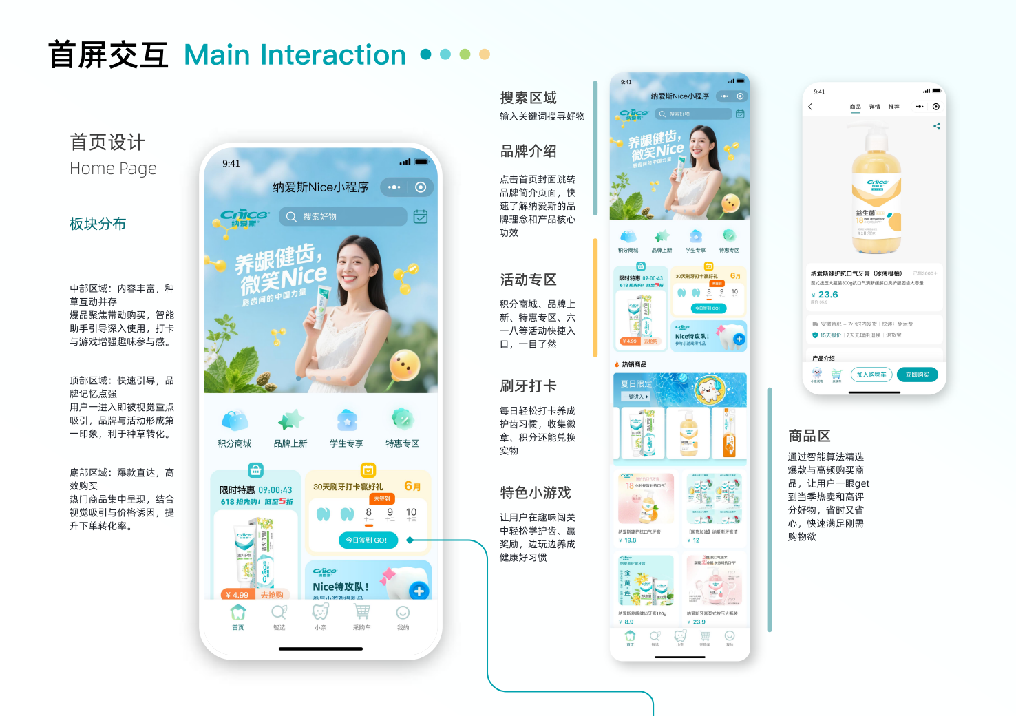 创意说明:纳爱斯智能小程序以“健康·智能·趣味”为核心理念,融合购物、打卡、互动三大功能,打造全新口腔健康体验。用户可在平台便捷选购产品,同时通过刷牙打卡、成就徽章收集等互动形式养成良好习惯。程序设计强调视觉清新与操作流畅,以年轻化审美结合趣味化互动,强化用户粘性与品牌记忆。