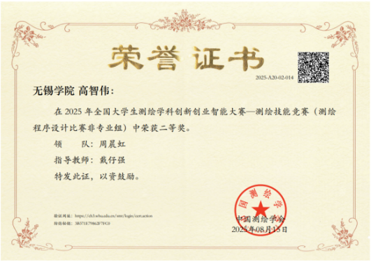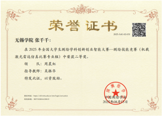 我校大气与遥感学院选派14支队伍参加全部赛道比赛,并在多个赛道实现突破。2023级测绘工程专业张千千同学凭借虚拟仿真平台实操能力,荣获“机载激光雷达仿真比赛”全国二等奖;2022级地理信息科学专业高智伟同学通过优化空间数据可视化程序,荣获“测绘程序设计比赛”全国二等奖,充分展现了学院“空天地一体化”人才培养的成效。