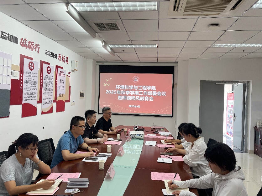 为明确新学期工作方向,确保各项工作开好局、起好步,紧密围绕“十五五”规划目标,扎实推进学院各项任务有序开展,9月12日中午,环境科学与工程学院在尚诚楼301会议室召开2025年秋季学期工作部署会议暨师德师风教育会。院长钱杰书、党总支副书记姜欢、副院长符波、院长助理卜久贺及学院全体教职工参加会议。会议由姜欢主持。