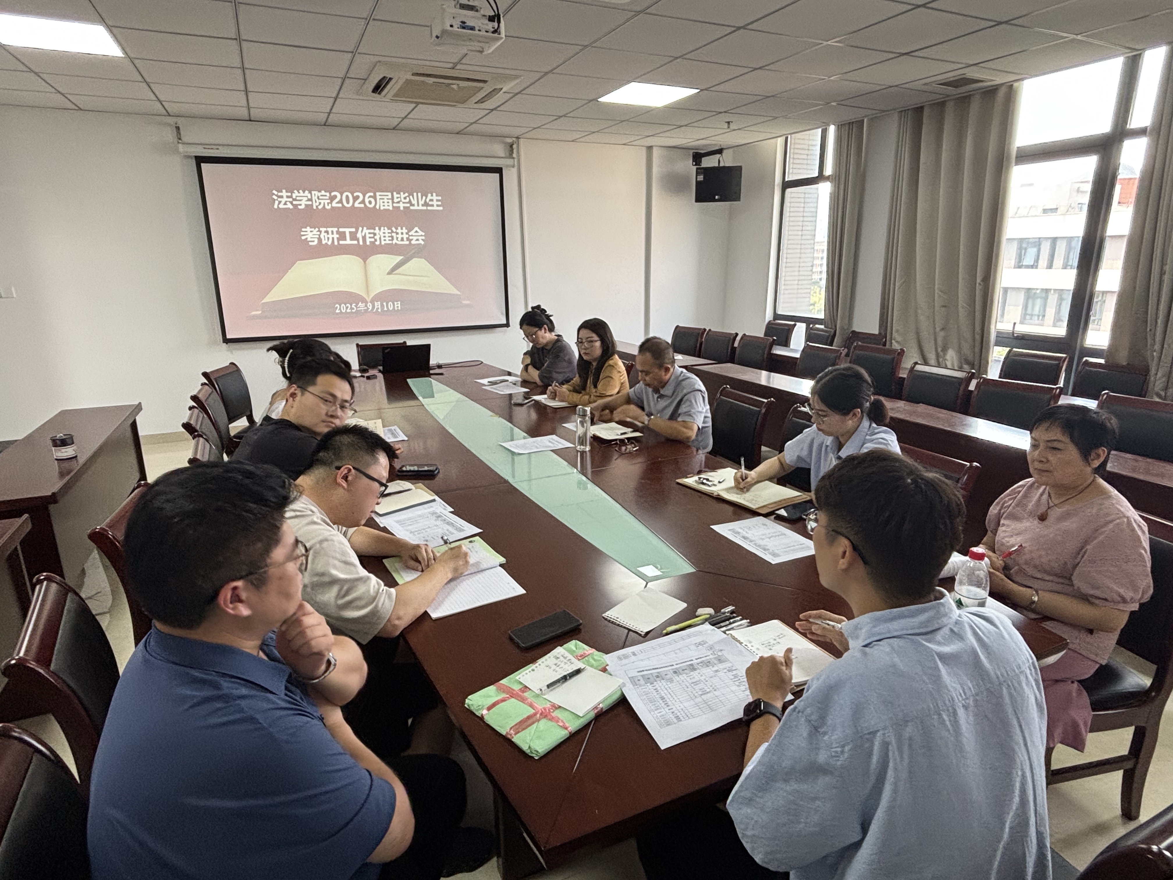 为进一步提升人才培养质量,扎实推进2026届毕业生考研升学工作,9月11日,马克思主义学院(法学院)在尚真楼511会议室召开2026届毕业生考研工作推进会。学院副院长张运书、党总支副书记王琳琳、法律系全体教师及毕业班辅导员参加会议。