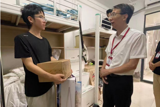 走访期间,校院领导与新生亲切交流,细致询问同学们的入学手续办理、生活起居及学习准备情况,特别关注家庭经济困难学生的实际需求,并送上精心准备的慰问物资。卢楚翰院长鼓励新生积极转变角色,主动适应大学集体生活,快速融入校园环境。范雪副书记就宿舍用电安全、防范电信诈骗等事项开展了细致的安全教育,引导学生增强自我保护意识,同时希望同学们科学制定学业规划,珍惜青春时光,夯实专业基础,锤炼综合能力,努力成长为有理想、有担当的新时代青年。