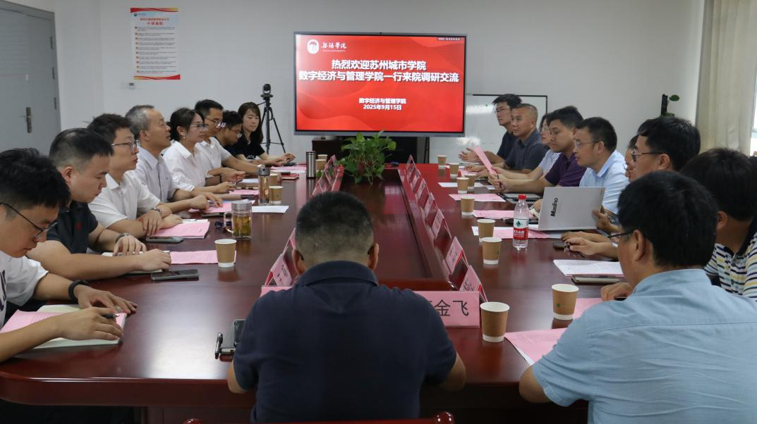 9月15日,苏州城市学院数字经济与管理学院院长王文华、副院长李惠娟一行来数字经济与管理学院调研交流。数字经济与管理学院院长刘军、党总支副书记李诗雅、副院长刘震及相关人员参加了座谈。