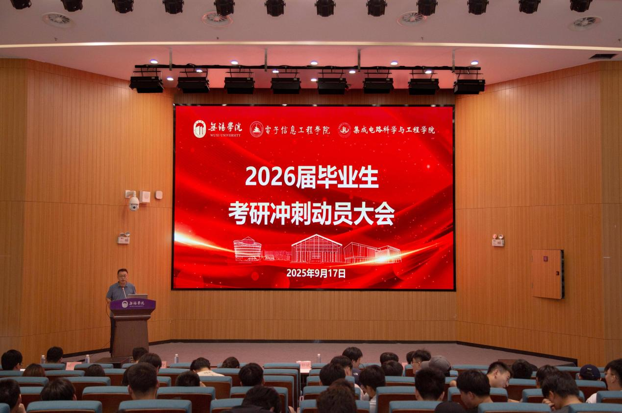 9月17日,电子信息工程学院(集成电路科学与工程学院)在图书馆报告厅召开“为梦而战,百日冲刺”2026届考研动员大会。学院院长李松斌、副书记张健、副院长王伟,系主任、班主任代表,全体毕业班辅导员及2026届全体考研学生参会,共同吹响考研百日冲刺 “集结号”。