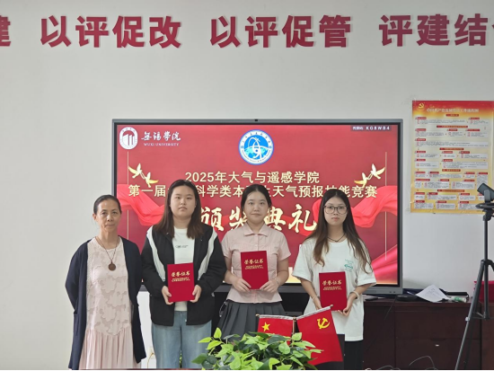 为深化大气科学专业教学与实践融合,激发学生专业兴趣与创新思维,9月24日至29日,大气与遥感学院举办“2025年第一届全院大气科学类本科生天气预报技能竞赛”。竞赛共吸引50名学生参赛,最终23人脱颖而出。无锡市气象局高级工程师沈雨辰应邀担任指导,党总支副书记范雪,学办主任张国宇,专任教师贾建颖共同出席颁奖仪式。