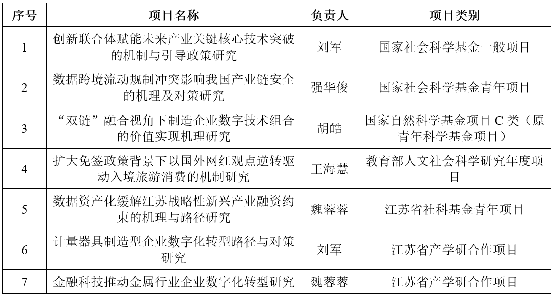 2025年,数字经济与管理学院(应急管理学院)高水平科研项目立项数量再创新高。截至目前,学院共获批国家社会科学基金项目2项、国家自然科学基金项目1项、教育部人文社会科学基金项目1项、江苏省社会科学基金项目1项、江苏省产学研合作项目2项。