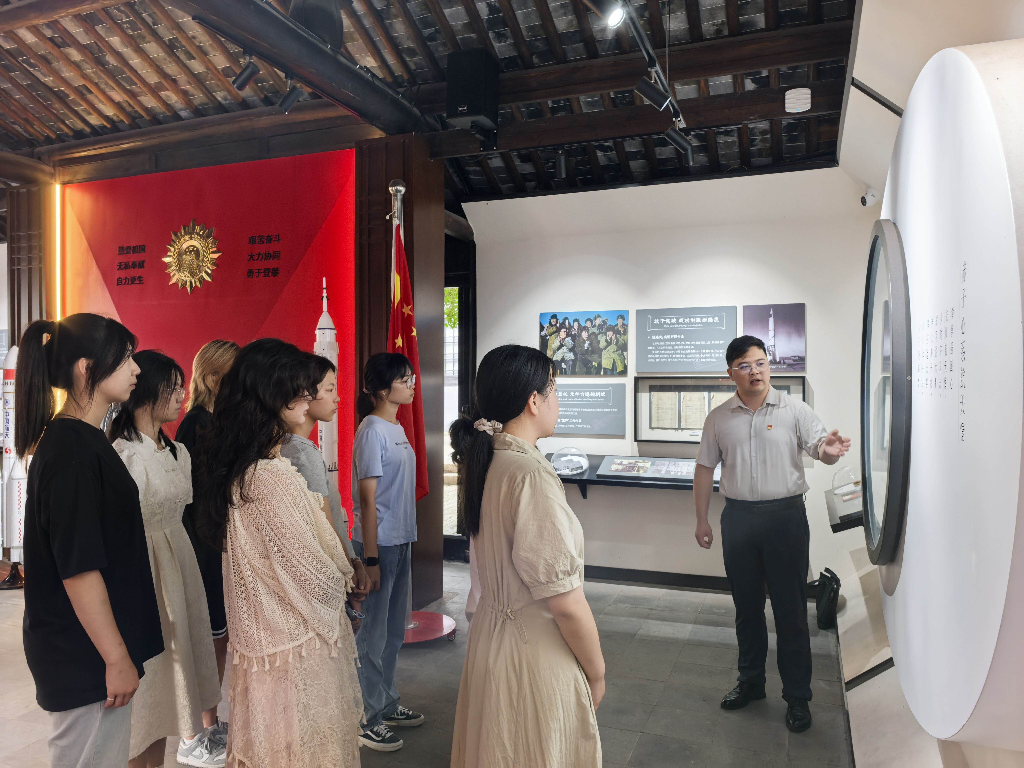 学院党员教师焦鑫带领2025级法学1班学生走进姚桐斌故居,开展“博物馆里的思政课”现场教学,讲解“两弹一星”元勋姚桐斌的生平事迹。四周陈列的100余幅珍贵图片及部分实物样品,系统再现了姚桐斌为国防事业奉献的光辉一生。焦老师的现场讲解,使学生深刻理解了姚桐斌严谨求实的科学精神和忠贞报国的爱国情怀,加深了对“两弹一星”精神文化内涵的认识,激励大家坚定理想信念,传承精神血脉,勇担时代重任,为中国式现代化贡献青春力量。