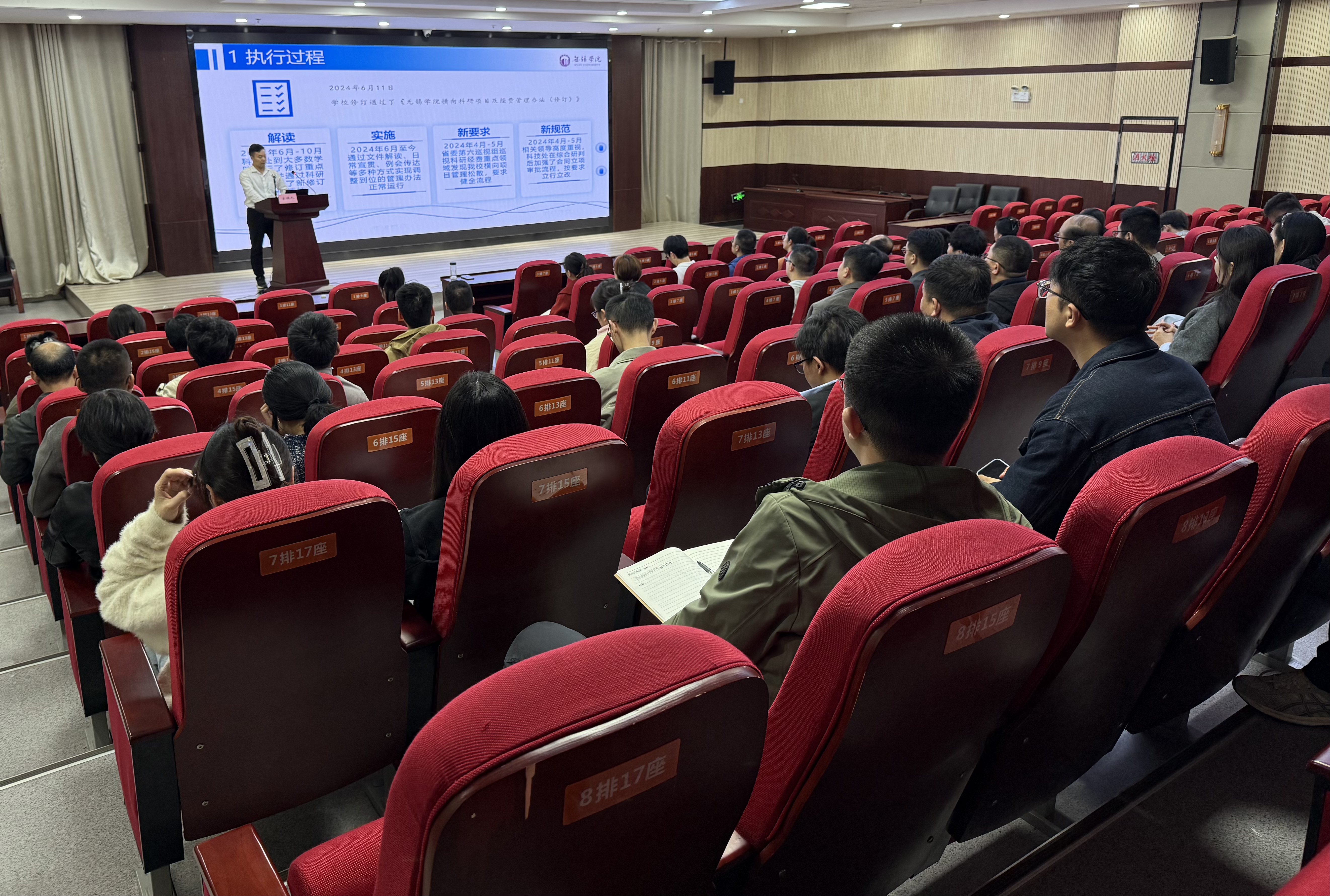 科技处产学研合作办公室副主任孙超系统梳理了横向科研项目从合同签订、立项备案到过程管理、结题验收、经费管理的全流程管理要点,清晰勾勒项目管理的整体脉络。财务处叶云霞聚焦经费使用的具体操作,详细讲解了横向经费入账、经费审批、费用报销等环节的规范要求与常见误区,为老师们高效、合规地使用科研经费提供了精准指导。审计处杨灵娟副处长结合近年来科研审计中的典型案例,深入剖析了横向经费使用中易发、高发的突出问题与潜在风险,以案为鉴,为全体与会人员上了一堂生动的“警示课”。