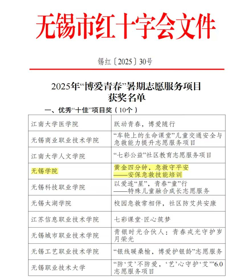 近日,无锡市红十字会发布了关于2025年“博爱青春”暑期志愿服务项目实施情况的通报结果,我校“黄金四分钟,急救守平安——安保急救技能培训”志愿服务项目获优秀“十佳”项目奖,1名老师获评“优秀指导老师”,4名同学获评“优秀志愿者”。