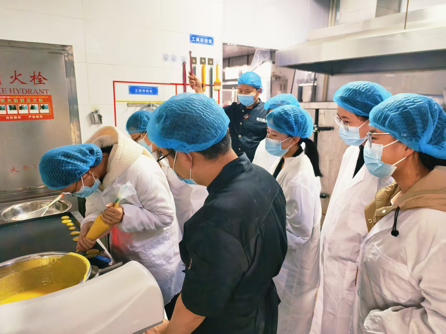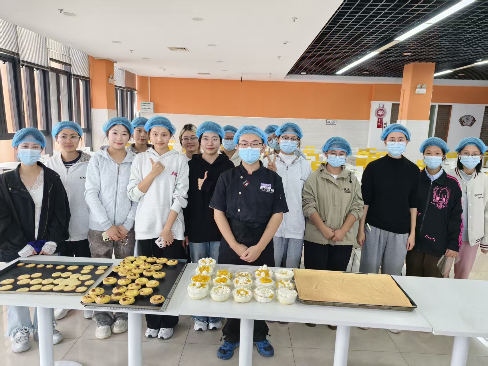 活动现场,餐厅后厨操作台上整齐陈列着面粉、黄油、鸡蛋等新鲜食材,专业西点师傅从原料配比、工具使用到揉捏技巧、烘烤温度等环节,为同学们进行了细致讲解与示范。同学们热情高涨,纷纷化身“烘焙小达人”,在师傅的指导下,认真完成称量、搅拌、揉面、塑型等步骤,亲手制作了手工饼干、奶油蛋糕和蛋挞等美味点心。活动中,大家不仅学习了烘焙技艺,更在协作与分享中收获满满成就感。