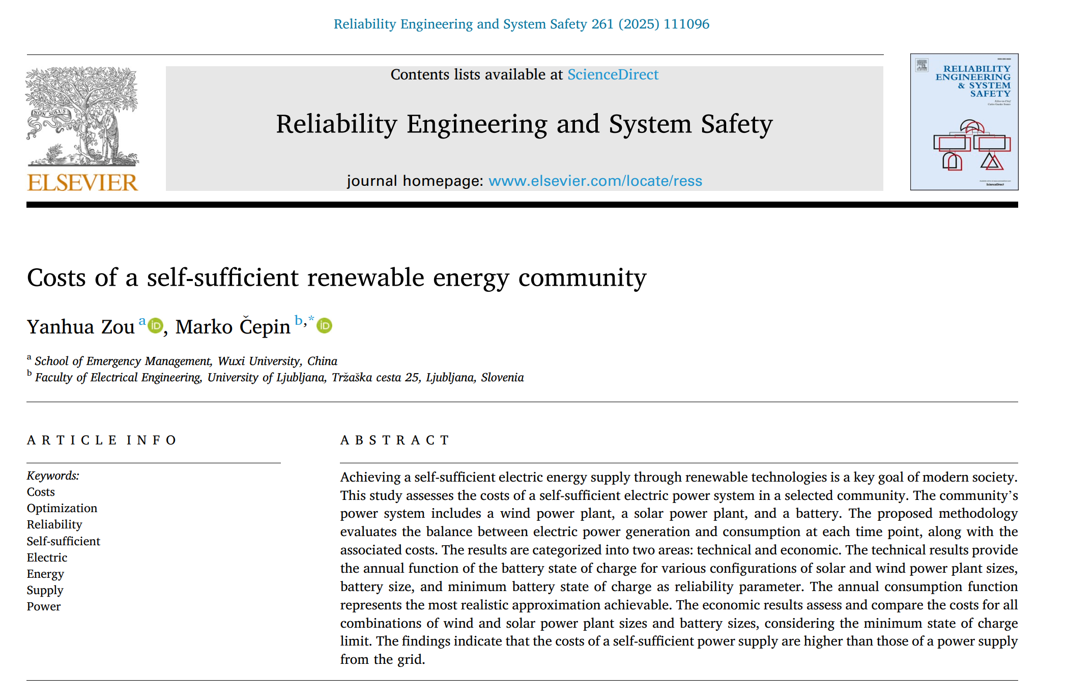 同时,邹衍华教授团队与卢布尔雅那大学(University of Ljubljana)Marko Čepin教授团队合作的科研论文《Costs of a Self-Sufficient Renewable Energy Community》在可靠性工程领域国际顶级期刊《Reliability Engineering & System Safety》(中科院一区Top期刊,IF=11)上发表,我校为第一作者单位。该论文构建了风—光—储自给式能源社区模型,并在可靠供能约束下对风电、光伏与电池容量组合进行系统成本优化,为社区级可再生能源系统规划提供了定量化的模型与分析支撑,有助于社区能源系统的安全稳定运行和可再生能源高效利用。