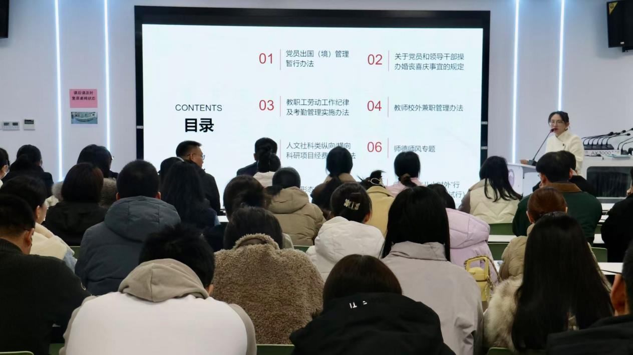为深入学习贯彻习近平新时代中国特色社会主义思想,强化全院教师的法治观念、纪律意识和责任担当,11月19日,数字经济与管理学院党总支召开专题学习会,集中学习党规党纪与法治知识。会议由学院党总支副书记李诗雅主持,学院全体教职工参加会议。
