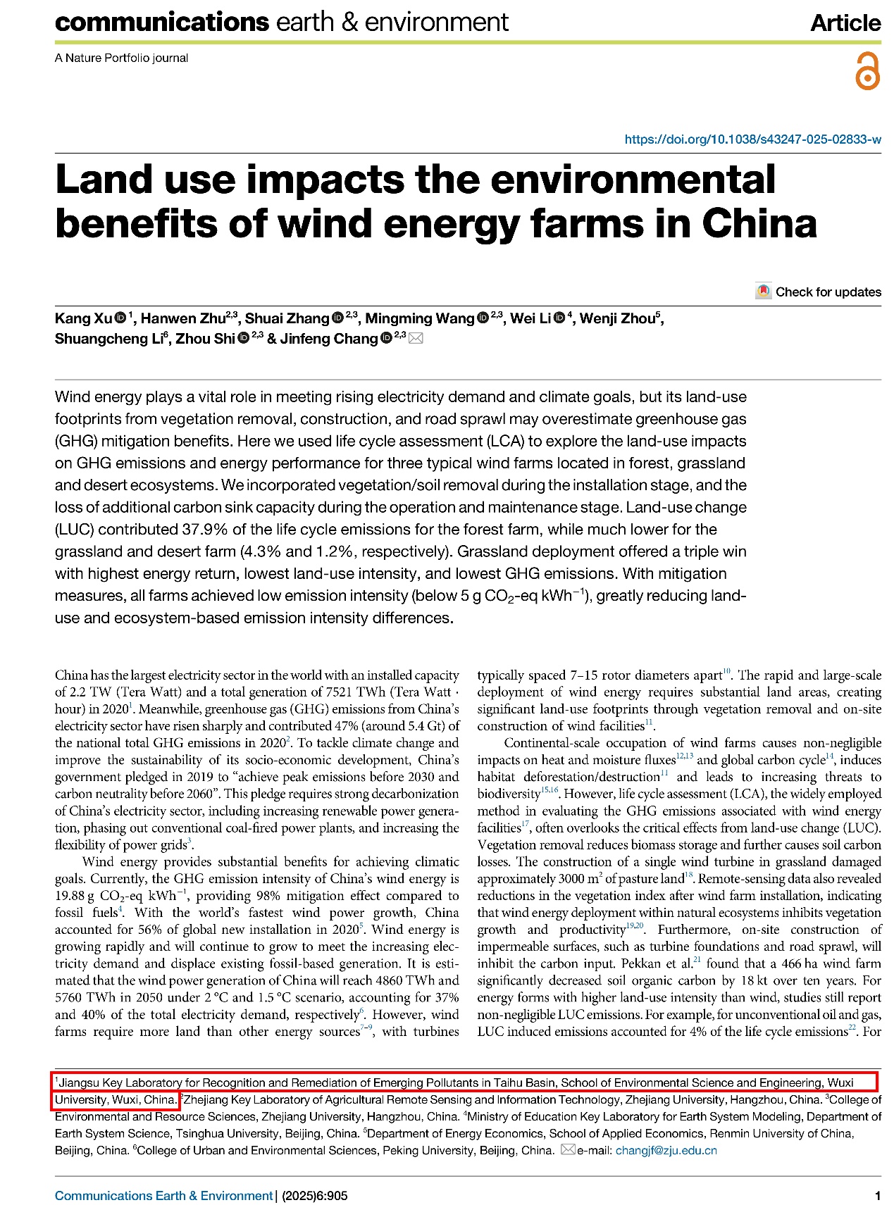 近日,我校徐亢博士与浙江大学环境与资源学院常锦峰研究员团队合作,在Nature出版社旗下(Nature Portfolio Journal)期刊《Communications Earth & Environment》(中科院一区top,影响因子:8.9)上发表题为《Land use impacts the environmental benefits of wind energy farms in China》的研究论文,太湖流域特征新污染物识别与绿色治理重点实验室及环境科学与工程学院为第一完成单位。研究系统评估了不同生态系统(森林、草原、沙漠)中风电场的全生命周期温室气体排放与能源绩效,揭示了土地利用变化对风电场环境效益的显著影响,论文全文链接:https://doi.org/10.1038/s43247-025-02833-w。
