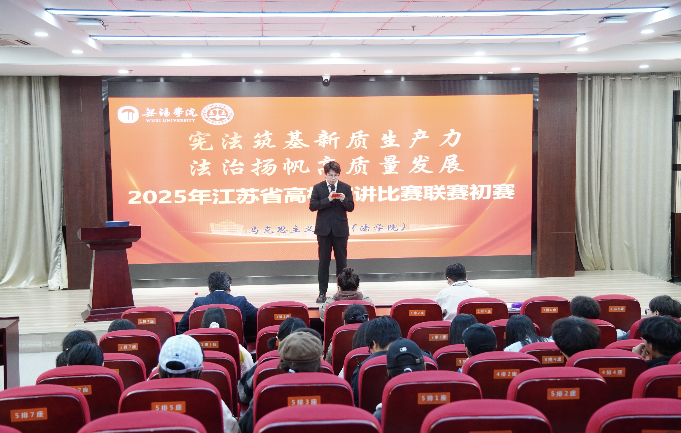 为深化宪法教育,弘扬法治精神,11月13日,马克思主义学院(法学院)举办“宪法筑基新质生产力,法治扬帆高质量发展”主题演讲比赛。本次比赛吸引了24级、25级多支团队参赛,他们以饱满的热情、生动的语言,深入诠释了对宪法的理解与感悟。马克思学院(法学院)党总支副书记王琳琳、专任教师高峰、辅导员董磊担任本次活动的评委。