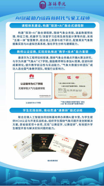 以课程、教学、师资改革为支撑,学院聚焦学生实践创新能力培育,建立“课程学习—学科竞赛—科学研究”链式人才培养体系。通过联合无锡人工智能协同创新基地共建实践平台,举办昇腾AI夏令营,为学生提供权威认证培训与真实项目开发实战机会;引导学生围绕气象预报精准化、灾害预警智能化等行业痛点问题开展创新研究。近年来,学生团队已累计斩获省级及以上学科竞赛奖项十余项,有效实现“以赛促学、以赛促研、以赛促创”的育人目标。