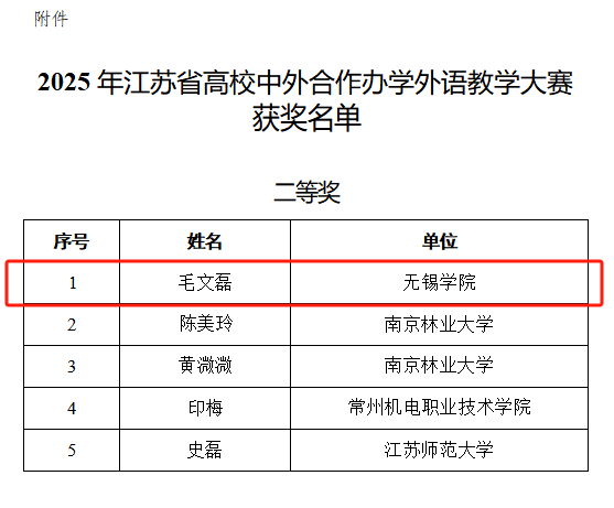 近日,2025年江苏省高校中外合作办学外语教学大赛决赛在南京审计大学顺利举办。我校传媒与艺术学院毛文磊老师荣获二等奖。