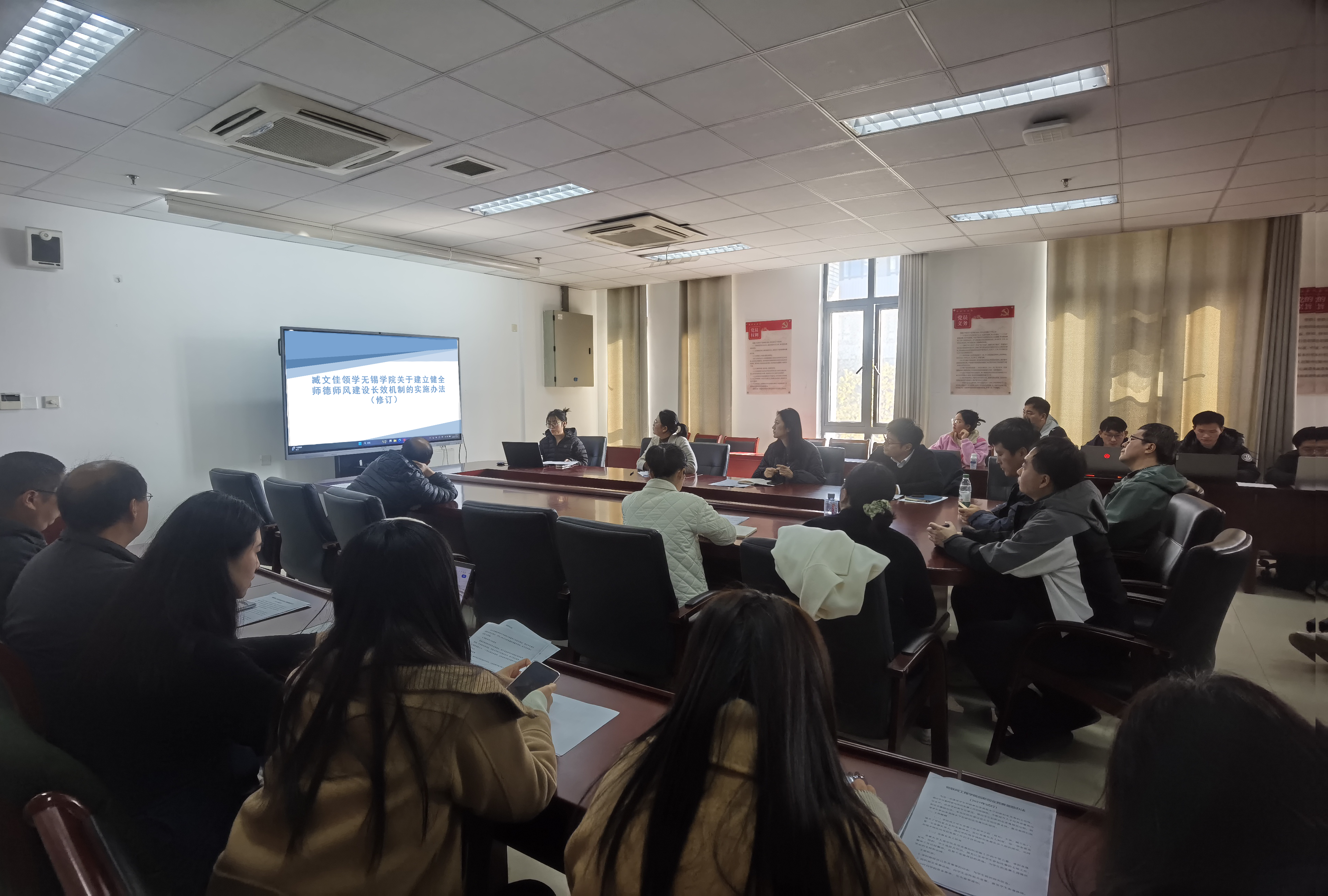 会议聚焦师德师风建设长效机制,通过制度解读、案例分析等形式,着力提升教师队伍思想政治素质和职业道德水平。会上,臧文佳带领全体教职工深入学习了《无锡学院关于建立健全师德师风建设长效机制的实施办法(修订)》,从总则、组织架构、师德教育、表彰激励、准入机制等方面全面细致进行了解读,强调师德师风作为评价教师队伍素质的第一标准,必须贯穿于教师职业发展的每一个阶段,全面覆盖教学、科研、人才培养等各个关键领域。