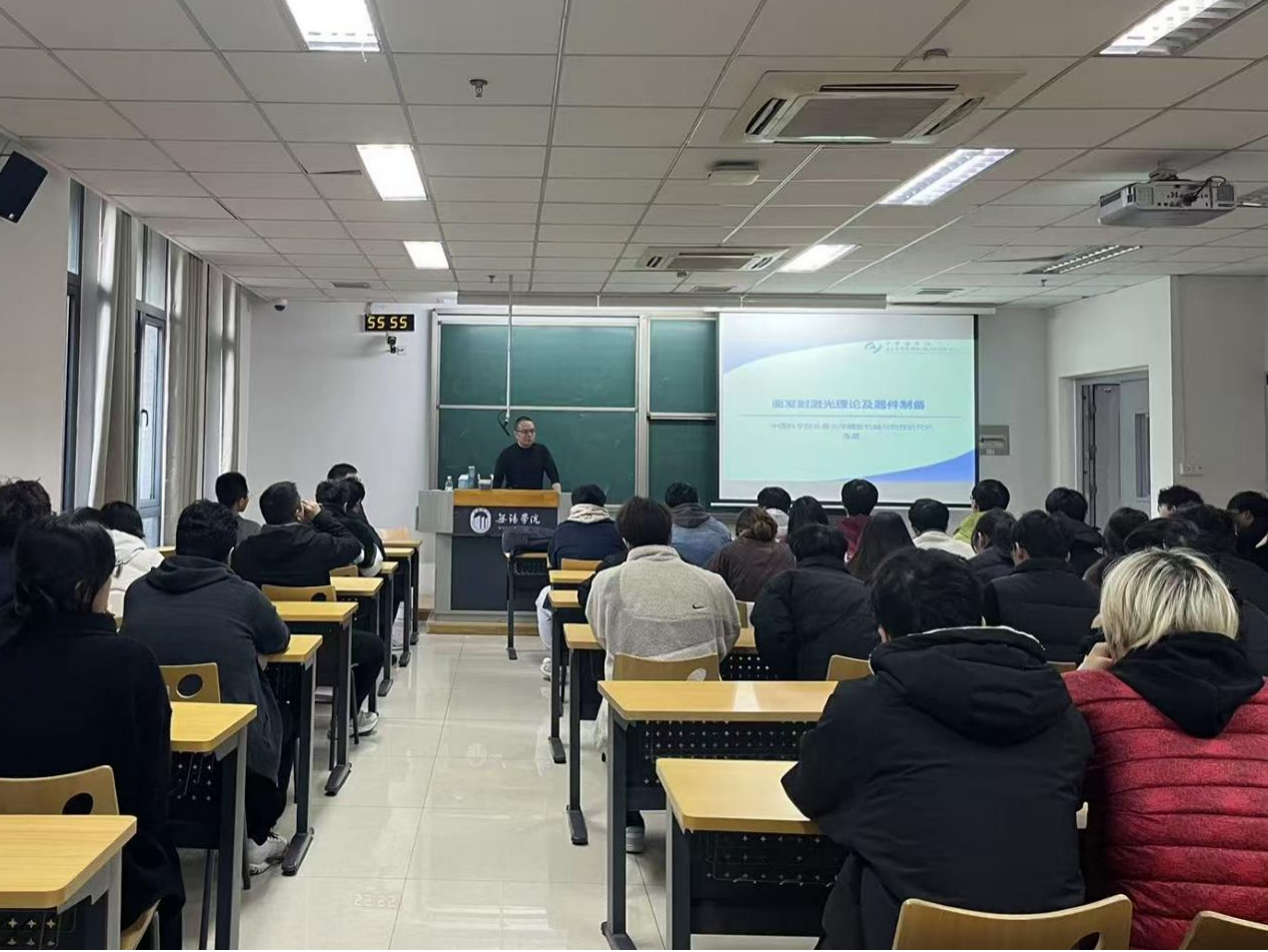 张星教授以“面发射激光理论及器件制备”为主题开展专题分享。他从面发射激光器的核心工作原理切入,系统讲解了器件从材料选型、结构设计到工艺流程优化的全链条制造路径;结合长光时空在相关领域的产业应用实践,梳理了该技术方向的关键技术瓶颈、工程化落地难点及行业发展趋势,帮助同学们构建起“基础理论—器件结构—制程实现—前沿进展”的系统化知识框架。