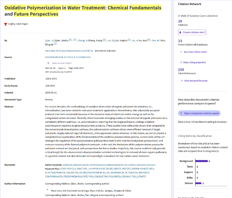 2025年1月6日,我校水污染控制与资源化团队在自然指数(Nature Index)期刊、美国化学会(ACS)旗下环境领域学术旗舰期刊Environmental Science and Technology发表学术论文《Oxidative Polymerization in Water Treatment: Chemical Fundamentals and Future Perspectives》,原文链接:https://pubs.acs.org/doi/10.1021/acs.est.4c10073?ref=pdf。