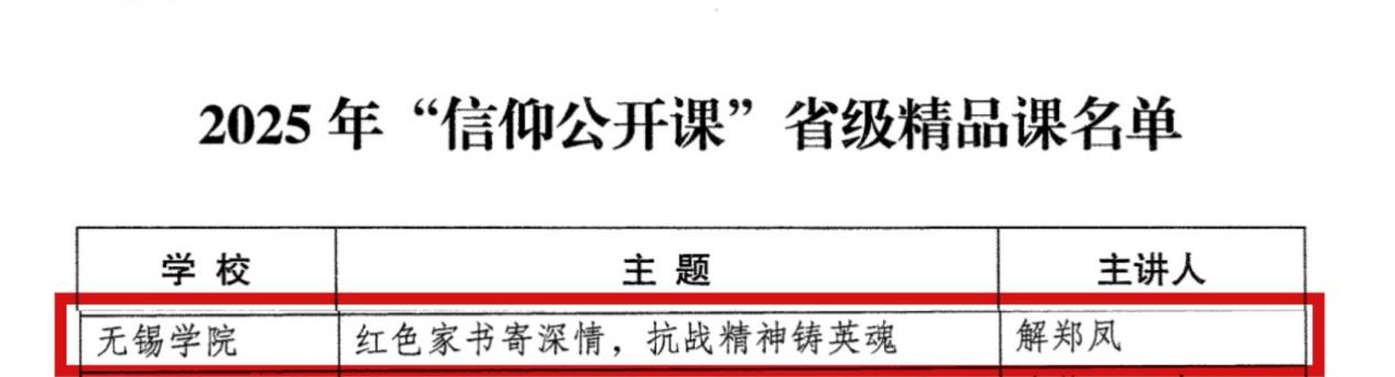 近日,共青团江苏省委公布了2025年全省高校“信仰公开课”省级精品课评选结果,我校团委选送的《红色家书寄深情,抗战精神铸英魂》课程成功入选。