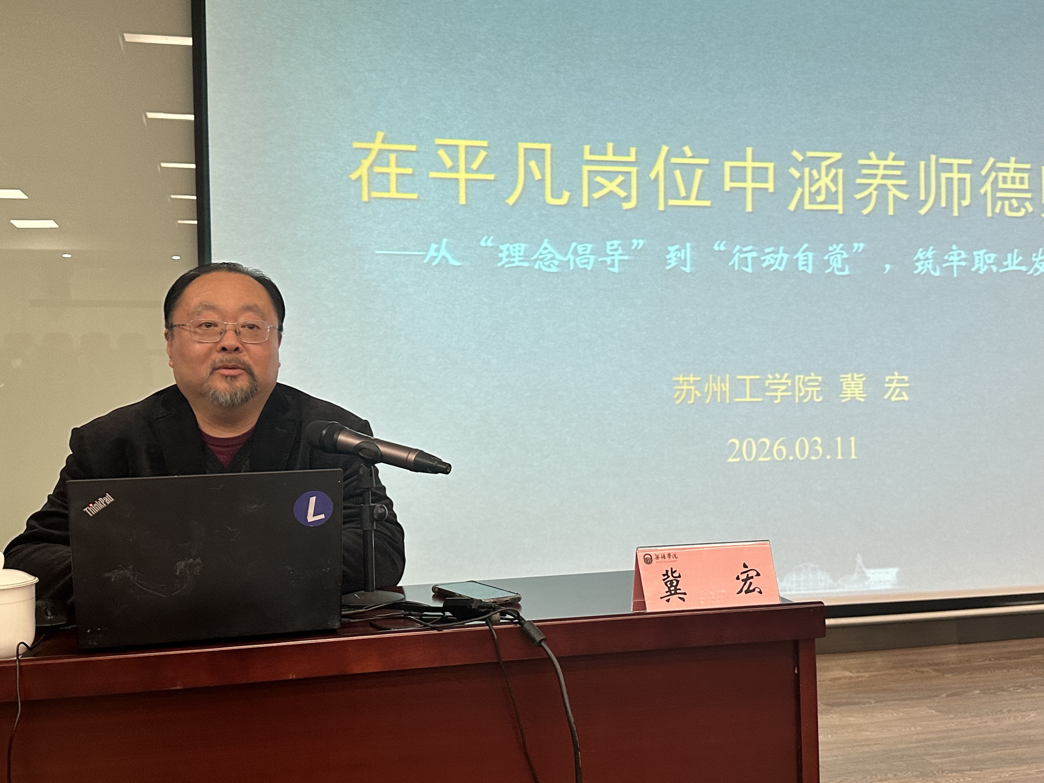 为深化新时代教师队伍建设,助力青年教师筑牢职业发展根基,3月11日,我校在行政楼227会议室举办2025-2026学年第二学期新教师培训开班仪式暨新教师培训系列讲座第十七期。本期讲座特邀苏州工学院质量管理与发展处副处长、江苏省教学名师冀宏教授作题为《在平凡岗位中涵养师德师风——从“理念倡导”到“行动自觉”,筑牢职业发展根基》的专题报告。近50余名新教师参加,讲座由教师发展与教学评估中心副主任(挂职)汤艺琼主持。