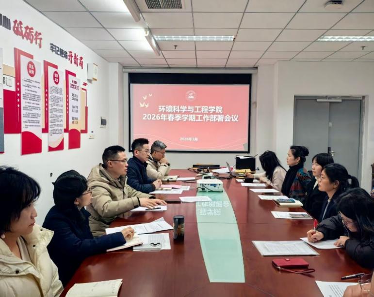 为深入学习贯彻2026年全国两会精神,全面落实学校新学期工作部署,扎实推进"十五五"规划开好局、起好步,3月11日下午,环境科学与工程学院在尚诚楼301会议室召开2026年春季学期工作部署会议。院长钱杰书、党总支副书记姜欢、副院长符波、院长助理卜久贺及学院全体教职工参加会议,会议由姜欢主持。