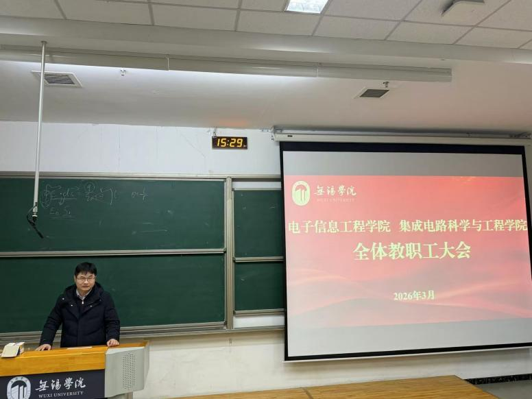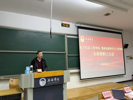 春启新程,实干为要。为深入贯彻学校新学期工作部署,凝聚学院干事创业合力,3月18日下午,电子信息工程学院(集成电路科学与工程学院)在思泉楼110召开全院教职工大会。党总支书记王铁邦、院长李松斌、党总支副书记张健、副院长王绶玙及全体教职工参会。大会由院长李松斌主持。