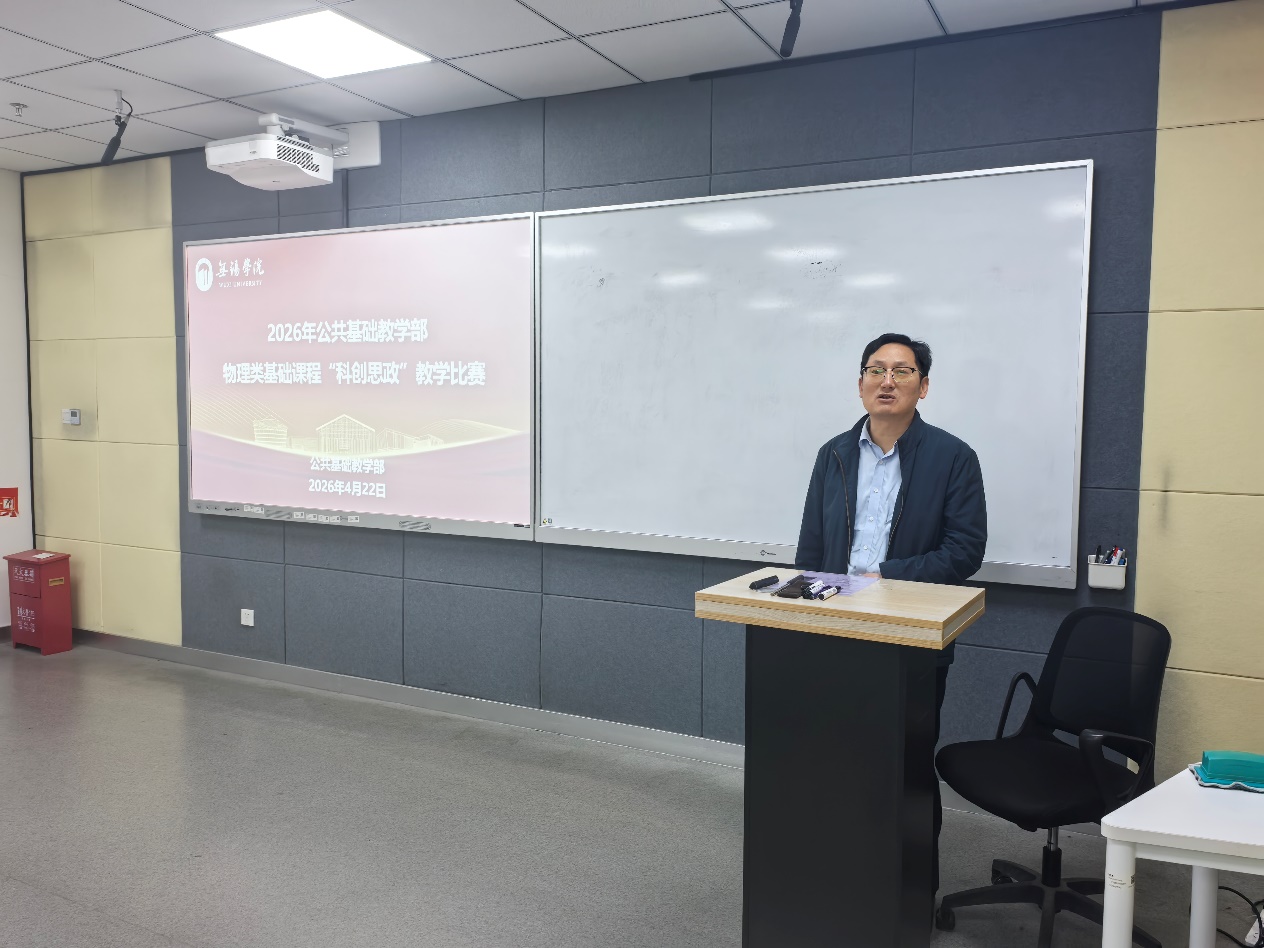 4月22日下午,公共基础教学部在尚真楼201举办2026年公共基础课程“科创思政”教学比赛大学物理基础赛道。教务处处长陈玉林,公共基础教学部副院长赵岚出席活动。本次比赛由大学物理教研室承办,共有8位专任教师参赛。