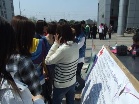 上午10时整,各项工作准备就绪,红十字会的志愿者们开始投入到紧张的工作中。招募活动现场,志愿者们精心制作的一个个展板真实地再现了09、10年的支教情况,破旧的教室桌椅,崎岖的山路,孩子们可爱的笑脸以及志愿者们给孩子们上课的情景让人震撼让人感动,吸引来众多学生。今年的招募不同以往,现场不仅有志愿者宣传,还设有支教咨询点,咨询点由支教团的相关人员组成,对支教有丰富的经验与感悟,可以让同学们更加真实了解支教情况。同学们在观看展板的同时,争先恐后的向支教团的同学询问具体事项与要求,红十字会同学就相关问题耐心对大家进行讲解。