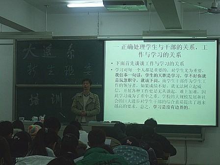 陈凯峰老师精心准备了本届新生班干培训会。以如何成为一名为同学们做实事、好事的学生干部为中心,从以下五个方面进行了讲解。一是,正确处理学生与干部的关系,工作与学习的关系;二是,合理分配工作的主次之分;三是,活的处理好人际关系;四是,学会总结,善于总结;五是,如何记好班委日志。陈老师结合他本人的经历,与新生班干们分享了他学生时代获得的宝贵经验,表达生动,紧扣实际,让同学们受益匪浅。