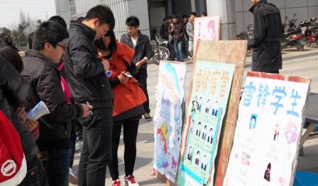 3月13日中午12点,会计系学生会在新食堂门口开展了 “雷锋精神永存 和谐校园共建”主题教育系列活动之“寻找我们身边的活雷锋”。由各班级和同学们积极推荐身边的“雷锋学生”和“雷锋宿管”,将候选人的先进事迹做成展板,组织进行大众投票评选。展板前,同学们纷纷驻足,为自己心目中的“活雷锋”投下神圣的一票。