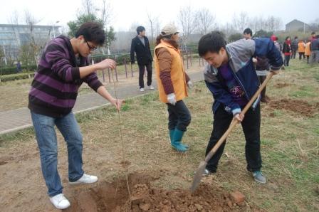在系会主席姚晨的带领下,系会成员和各班代表有序参与到活动中来。后勤阿姨们积极示范,挖土,刨坑,松土,覆盖,浇水……在她们热情帮助下,同学们干劲十足,有条不紊地将小树苗植入土中。经过1小时左右的努力,40棵小树苗已经顺利“安家”。