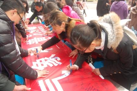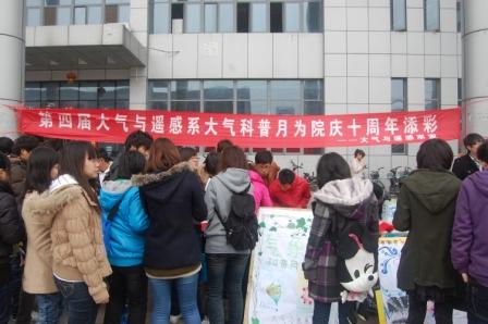 食堂门前大红横幅上“第四届大气与遥感系大气科普月为院庆十周年添彩”极其醒目,四周摆放着大遥系每个班级自创的大气科普知识的宣传海报。系会成员发放传单,讲解气象知识,号召同学们在“天气,气候和水为未来增添动力”的横幅上签名。活动中还穿插了气象科普知识的有奖竞猜环节。大遥系办公室主任王晶和系会指导老师陈凯峰也来到了现场进行宣传,场面十分火爆。