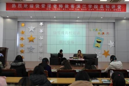 12月19日我院在报告厅举办第120期真知讲堂——“文字下的青春”,特别邀请到青春文学职业作家饶雪漫来我院与滨江学子交流写作心得与青春感悟。