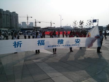 4月21日下午,滨江红会组织志愿者积极参加由南京市浦口区红十字会组织的祈福雅安的活动。与南京铁路职业技术学院志愿者,健康学院志愿者一同在弘阳广场进行了历时近3个小时的祈福雅安,募捐倡议。