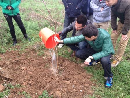 活动前,明确分工,确保活动期间井然有序。一组同学负责提前借来铁锹、水桶等工具;一组同学负责选择位置、指挥;一组同学负责种植树苗、浇水;大家热情高涨,互相帮助,忙碌得挖坑、种树、浇水、填坑……经过2个小时的辛勤劳动,一棵棵小树苗挺拔地站立在小坡上。