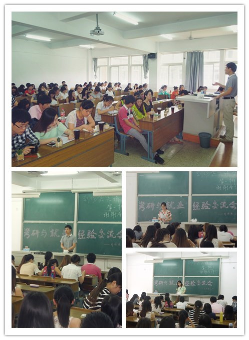5月28日下午,外语系毕业生考研就业经验交流会在ZC204举行。此次活动邀请了外语系考研优秀指导老师张毅,10级黄亚星、周啸生、张其伟、沈雅珉、周彦廷等考研成功的代表,以及10级季凌冰、顾倩雯、江昀等成功就业的代表。他们结合自身经历,分别在考研学习方法和求职经验方面作了介绍。
