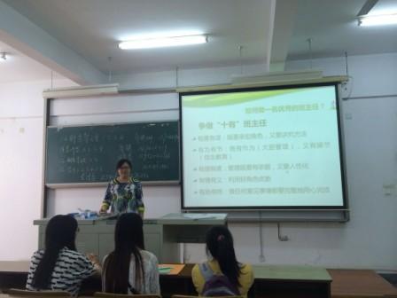 会计系聘任21名班主任,其中新聘班主任11名。郑老师就“如何成为一名优秀的班主任”跟大家进行了交流与分享。提出了工作中争做“十有”班主任。即“有勇有谋”,既要勇于承担角色责任,在班级中树立威信,又要讲究工作方法,针对不同学生采用不同管理方式;“有为有节”,工作要有作为,大胆管理班级,不能畏惧问题和矛盾,又要有操节,注重引导学生树立积极向上的理想信念;“有理有度”,班级管理中要凡事有依据,不能随意改变原则和纪律,又要人性化,关注学生的个性发展;“有情有义”,充分利用好自己的角色优势,做好学生的情感导师和知心朋友;“有始有终”做任何事情都要完整、用心地完成,用自己认真踏实、一丝不苟的处事态度影响和感染学生。